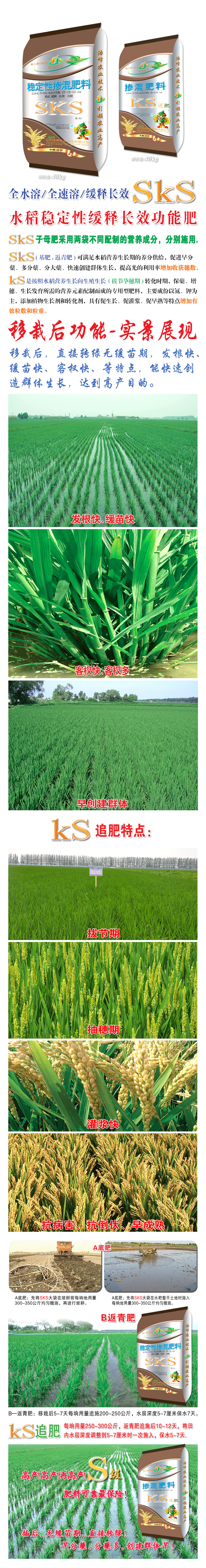 sks子母肥采用兩袋不同配制的營養(yǎng)成分,分別施用。sks (基肥.返青肥) 可滿足水稻營養(yǎng)生長期的養(yǎng)分供給,促進(jìn)早分蘗、多分蘗、分大蘗、快速創(chuàng)建群體生長,提高光的利用率增加收獲穗數(shù)。