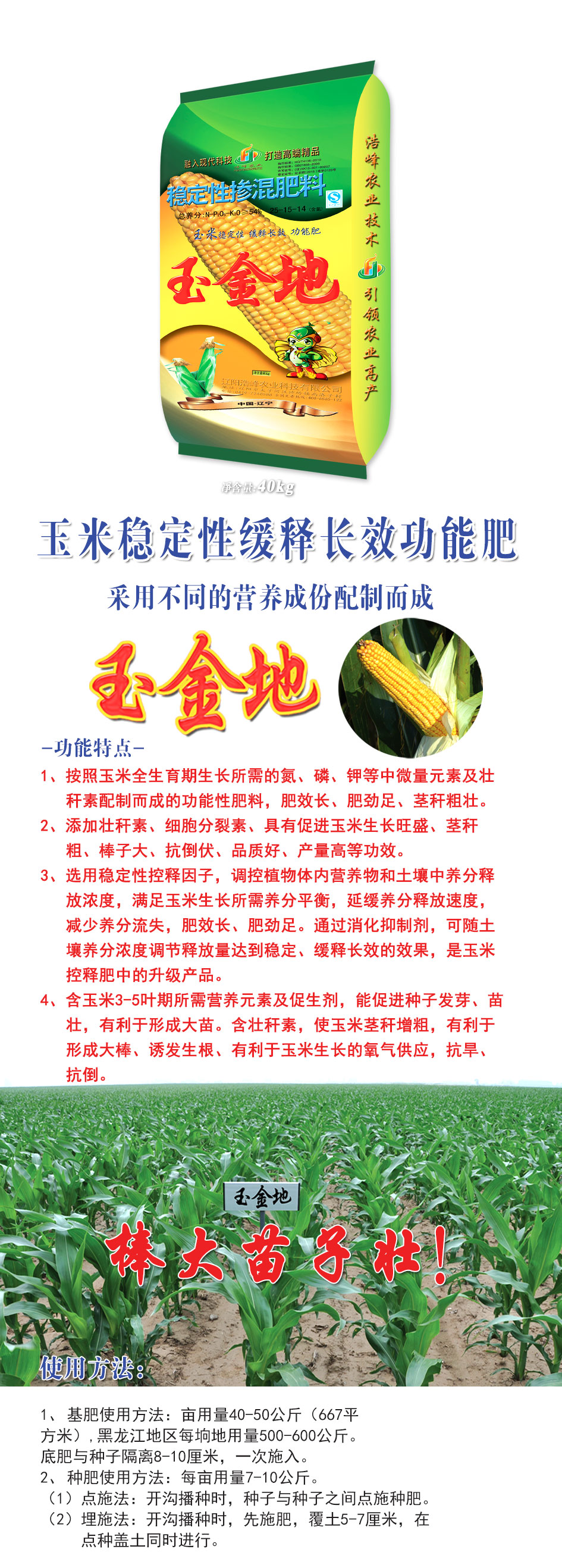 1、按照玉米全生育期生長(zhǎng)所需的氮、磷、鉀等中微量元素及壯稈素配制而成的功能性肥料,肥效長(zhǎng)、肥勁足、莖稈粗壯。